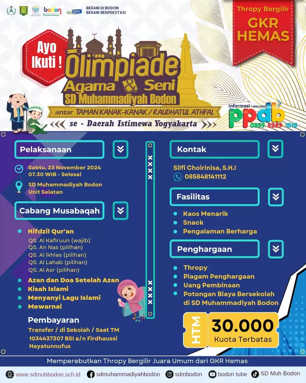 Ayo Segera DaftarOlimpiade Agama dan Seni #2 SD Muhammadiyah Bodon Kotagede Untuk RA/TK se-DIY 🎙️Alhamdulillah, kuota Musabaqah Hafizh Quran sudah…