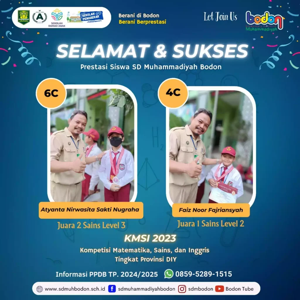 Siswa SD Muhammadiyah Bodon berhasil menjuarai Kompetisi Matematika, Sains, dan Bahasa Inggris (KMSI) tahun 2023. Beberapa siswa tersebut diantaranya adalah Faiz Noor Fajriansyah kelas 4C yang berhasil memperoleh Juara 1 Sains Level 2, Hanna Aliya Muchlis kelas 4C berhasil memperoleh Juara 3 Matematika Level 2, Ahmad Nuruzzaman kelas 5C yang berhasil menjuarai dua kategori yaitu Juara 2 Matematika Level 3 serta Juara 2 Bahasa Inggris Level 3, dan yang terakhir Atyanta Nirwasita Sakti Nugraha yang berhasil memperoleh Juara 2 Sains Level 3.